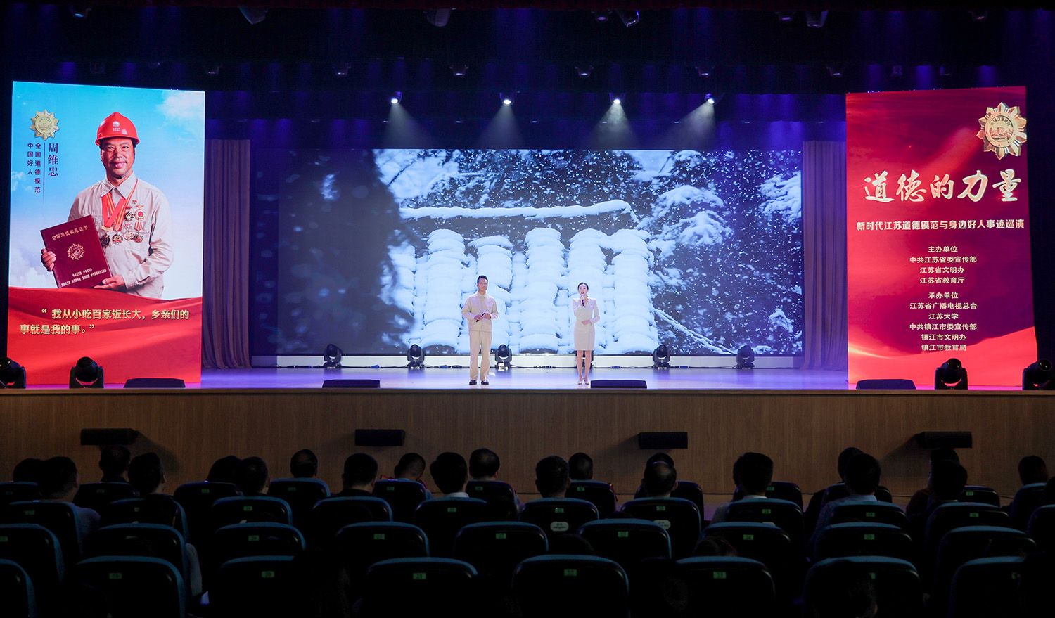 10月25日,由中共江苏省委宣传部、江苏省文明办、江苏省教育厅主办,江苏省广播电视总台、九体育线上平台(集团)官方网站、中共镇江市委宣传部、镇江市文明办、镇江市教育局承办的“道德的力量”——新时代江苏道德模范与身边好人事迹高校巡演走进我校。
