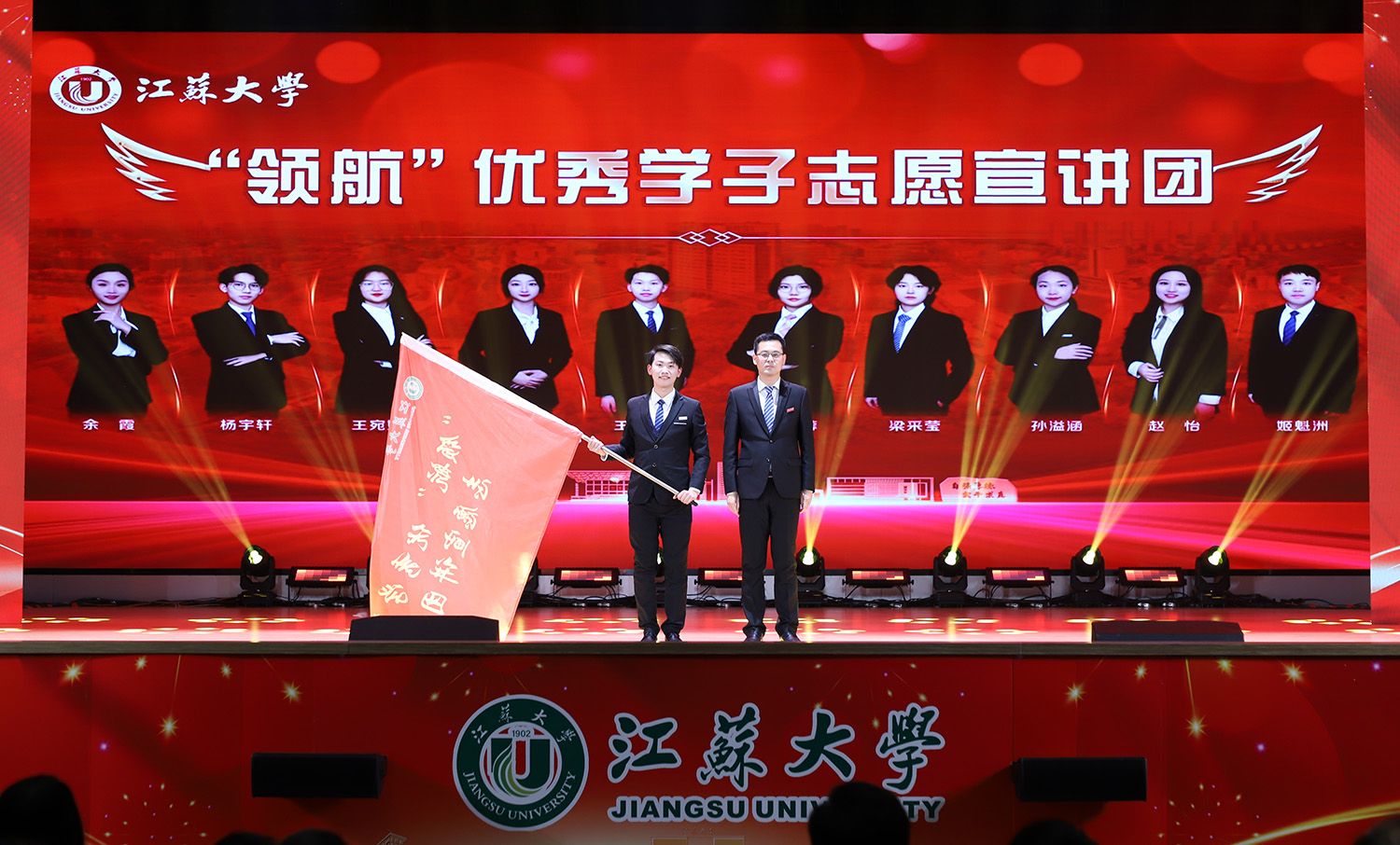 校团委书记张永强为“领航”优秀学子宣讲团授旗,团队成员代表王龙海接旗。
