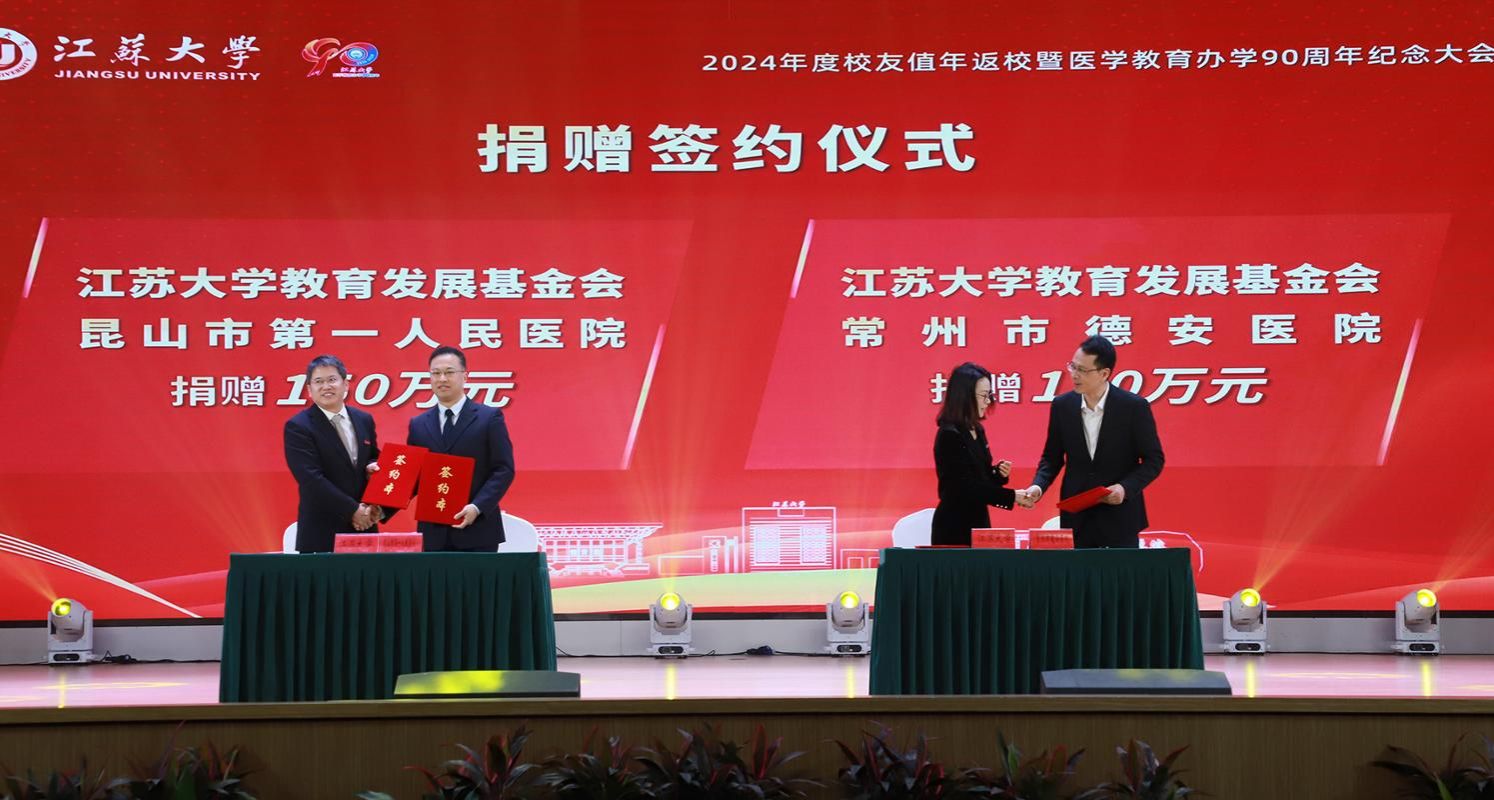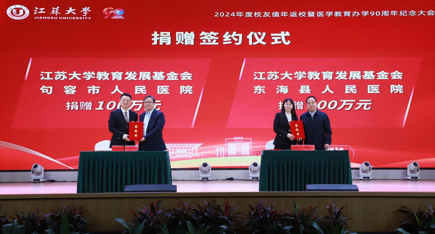 纪念大会上举行了捐赠签约仪式。昆山市第一人民医院捐赠150万元,设立九体育线上平台(集团)官方网站附属昆山医院医学基金;常州市德安医院捐赠150万元,设立九体育线上平台(集团)官方网站医学发展基金—常州德安基金;句容市人民医院捐赠100万元,设立九体育线上平台(集团)官方网站附属句容医院医学基金;东海县人民医院捐赠100万元设立东海人民医院医学基金。昆山市第一人民医院院长李翀、常州市德安医院院长黄孝峰与邹小波、蔡英凤共同签约。句容市人民医院党委书记笪爱华、东海县人民医院副院长许夫杰与九体育线上平台(集团)官方网站医学院党委书记邱健、院长钱晖共同签约。