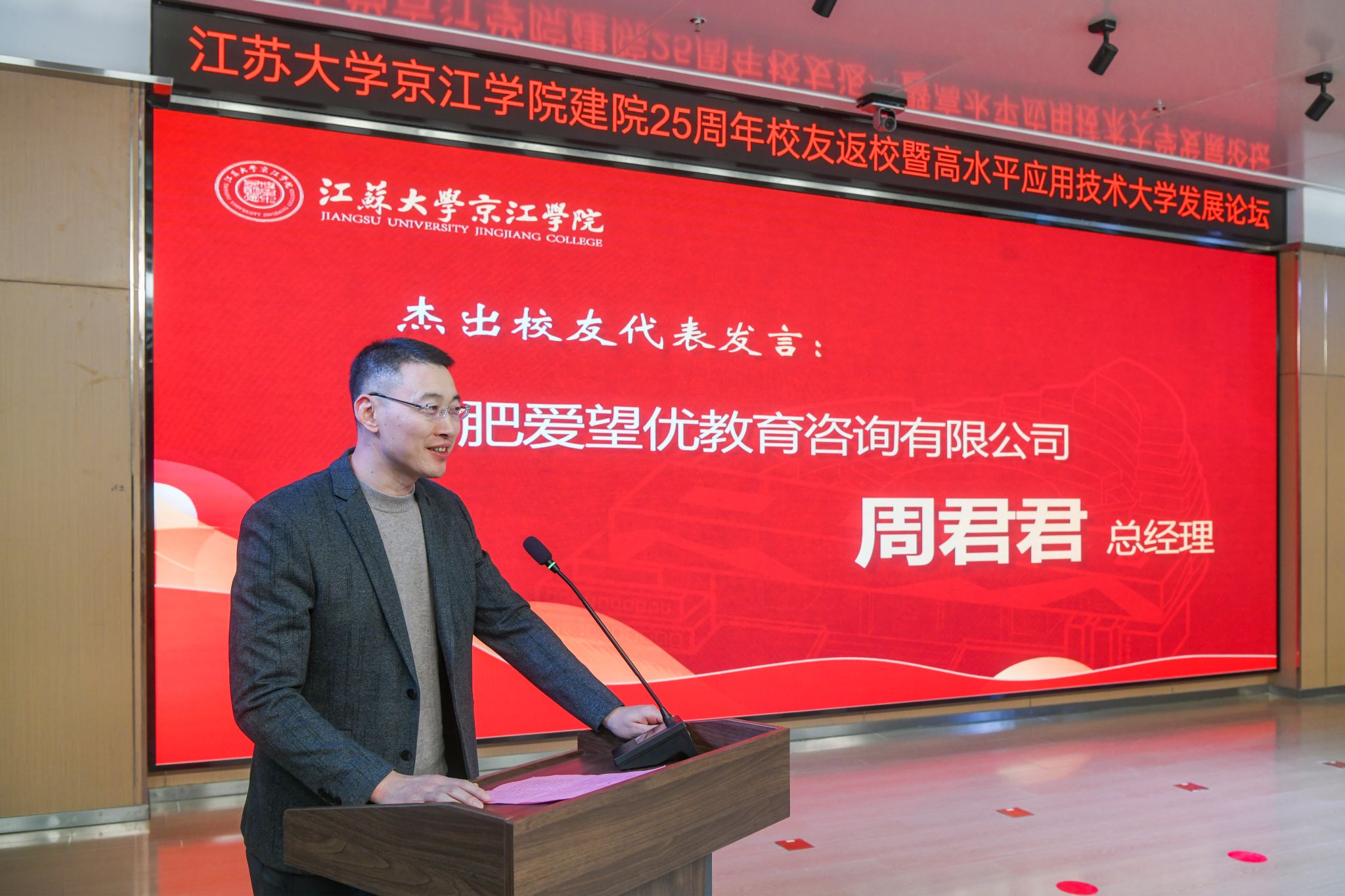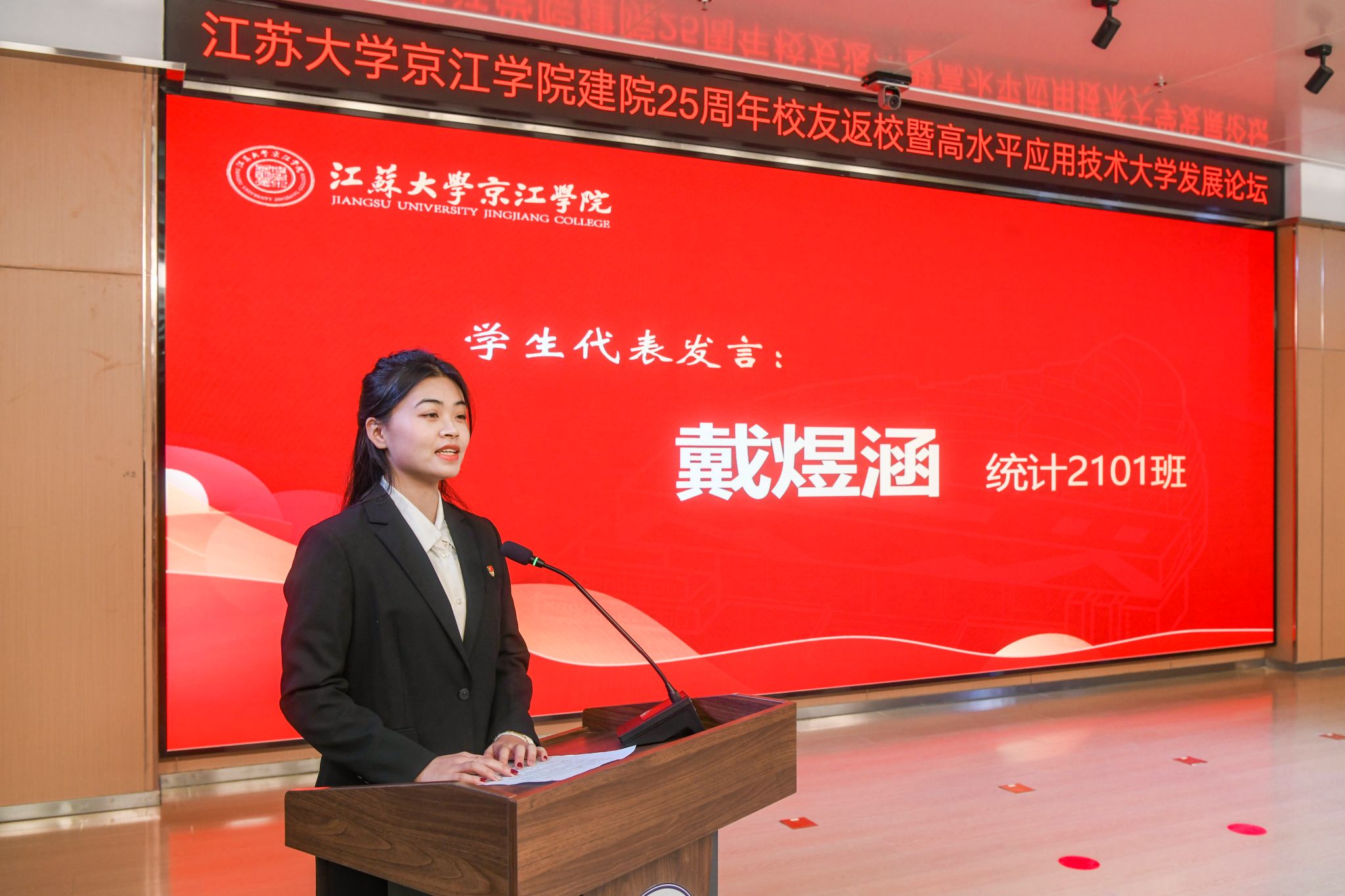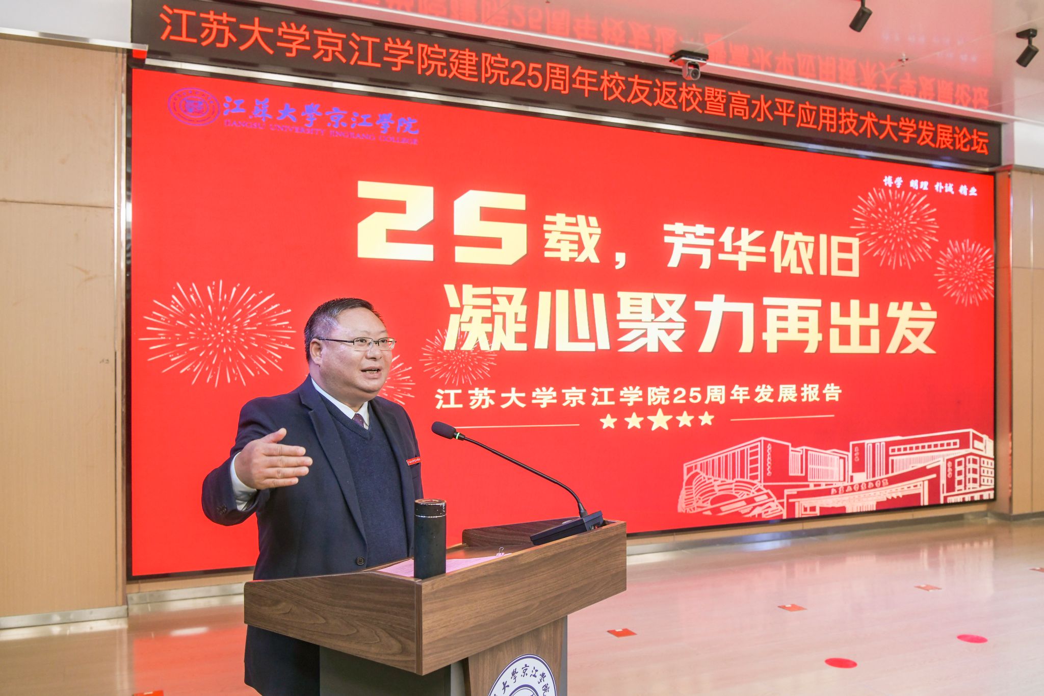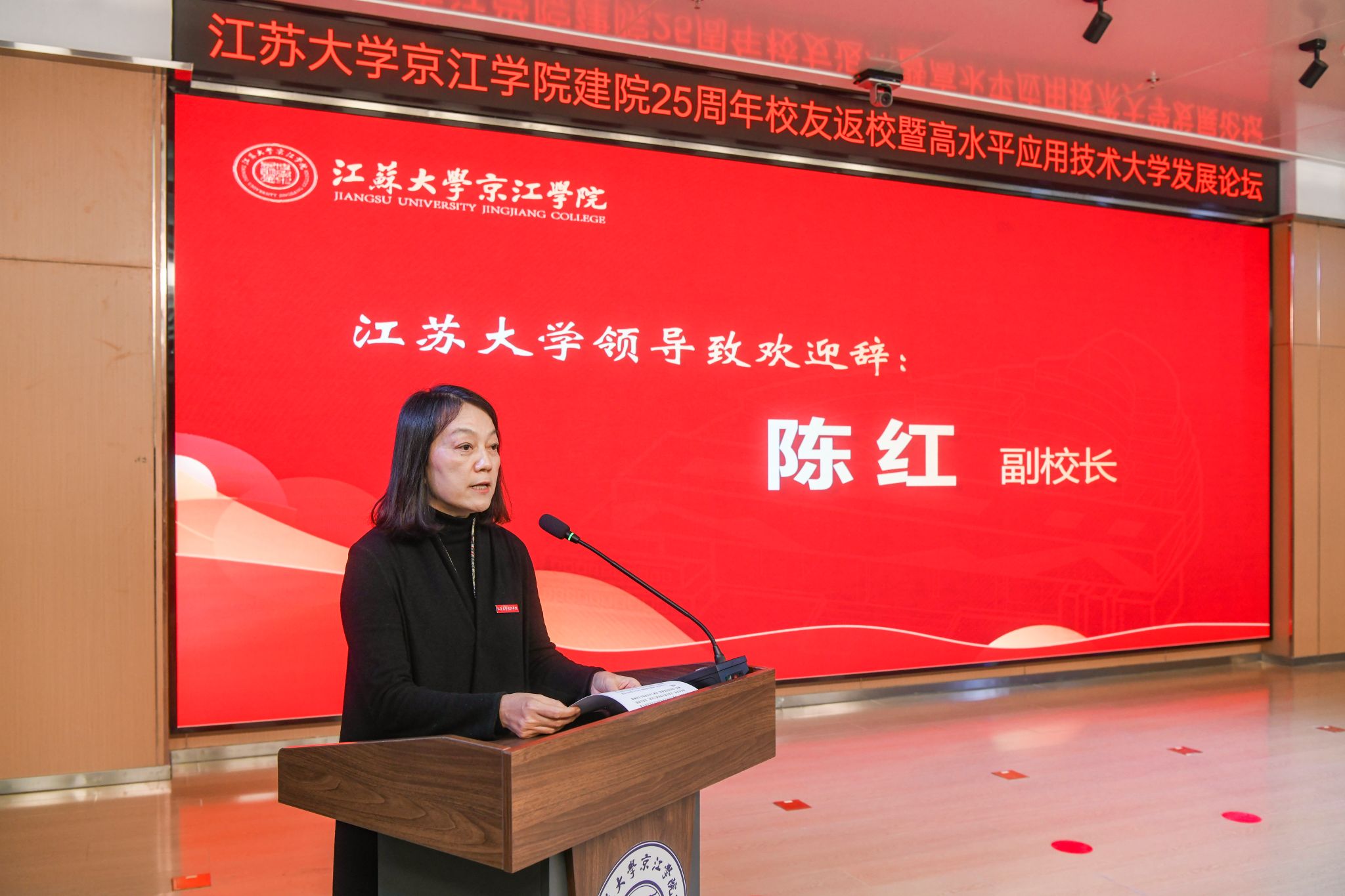 12月21日,京江学院在学术交流中心报告厅举行建院25周年校友返校暨高水平应用技术大学发展论坛。镇江市政协副主席、九体育线上平台(集团)官方网站副校长陈红,镇江市发展和改革委员会副主任朱华,南京师范大学中北学院院长戴传超,校友会与对外联络办公室主任李国昊,企业代表,京江学院全体院领导、校友代表、教师代表、学生代表出席大会。