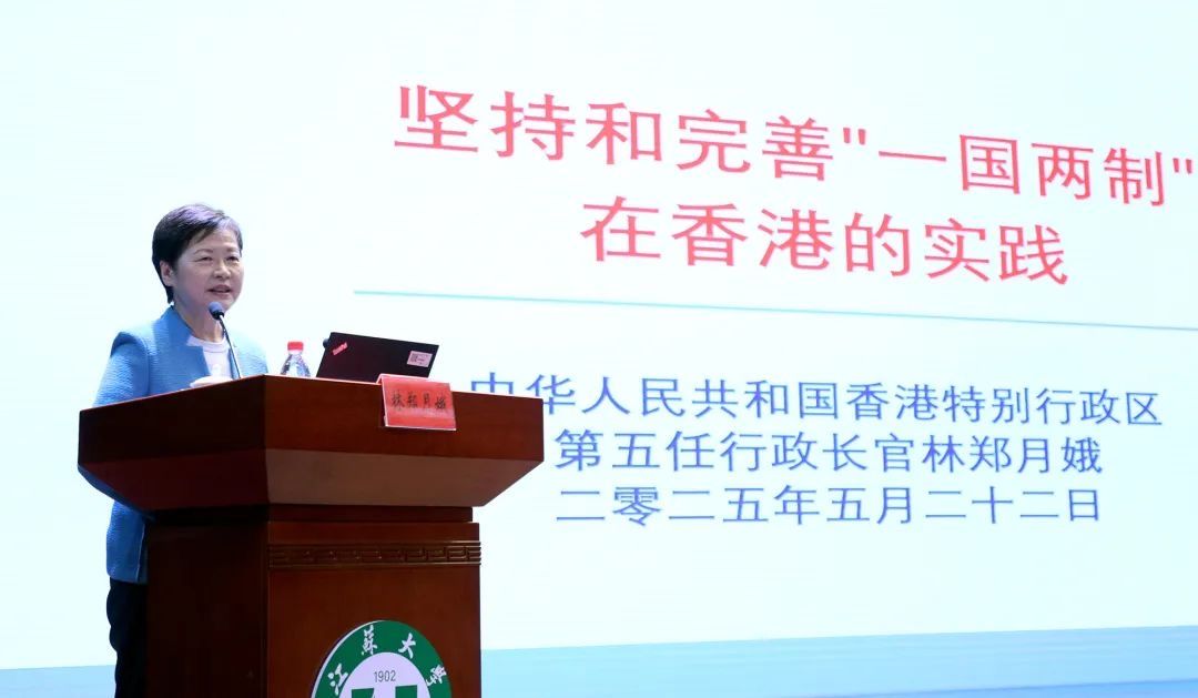 5月22日,香港科技经贸考察团一行二十余人到学校考察调研。香港特别行政区第五任行政长官、考察团荣誉团长林郑月娥应邀在小礼堂作题为《坚持和完善“一国两制”在香港的实践》的专题报告,并与师生亲切互动。