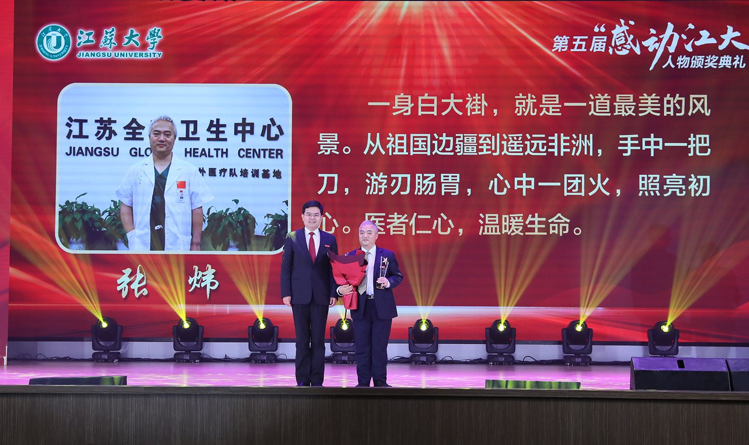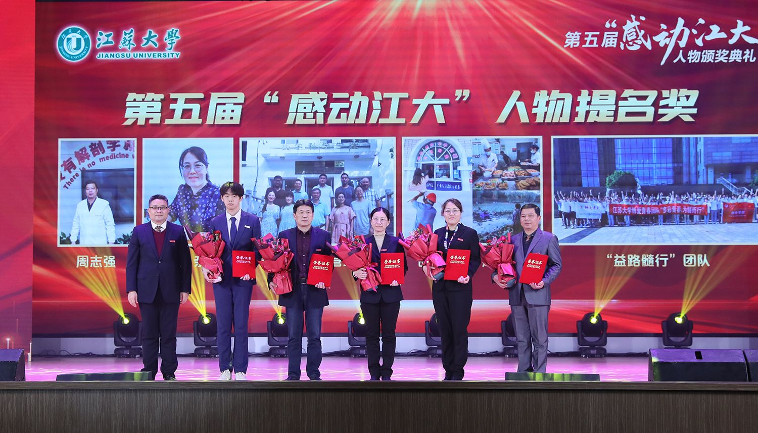 典礼现场,与会领导还为荣获第五届“感动九体育线上平台(集团)官方网站”人物提名奖的医学院教师周志强、药学院教师马亲、数学科学学院中外合作教学管理团队、后勤管理处品质后勤团队、财经学院“益路髓行”团队颁奖。