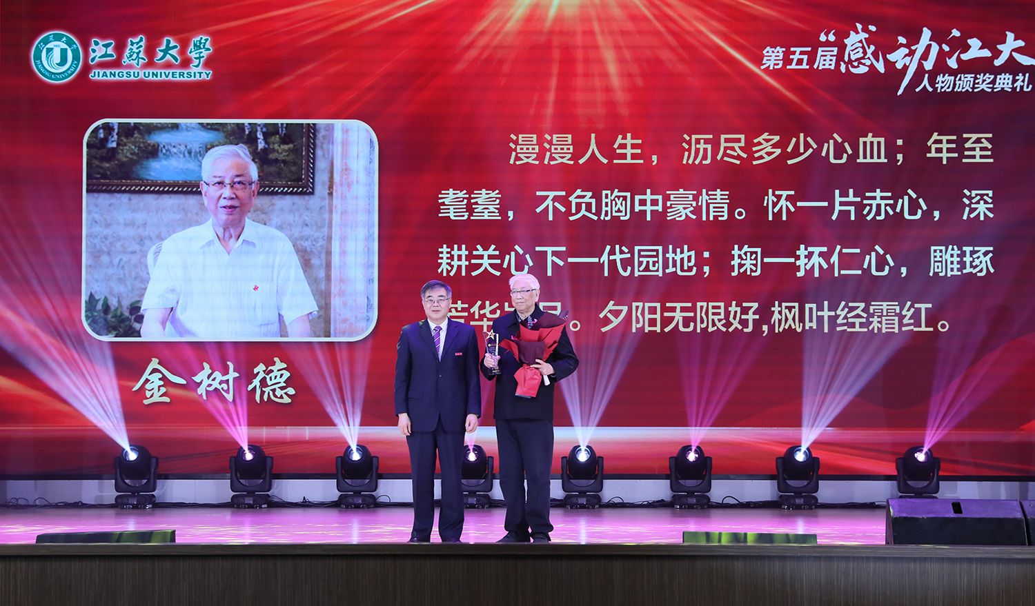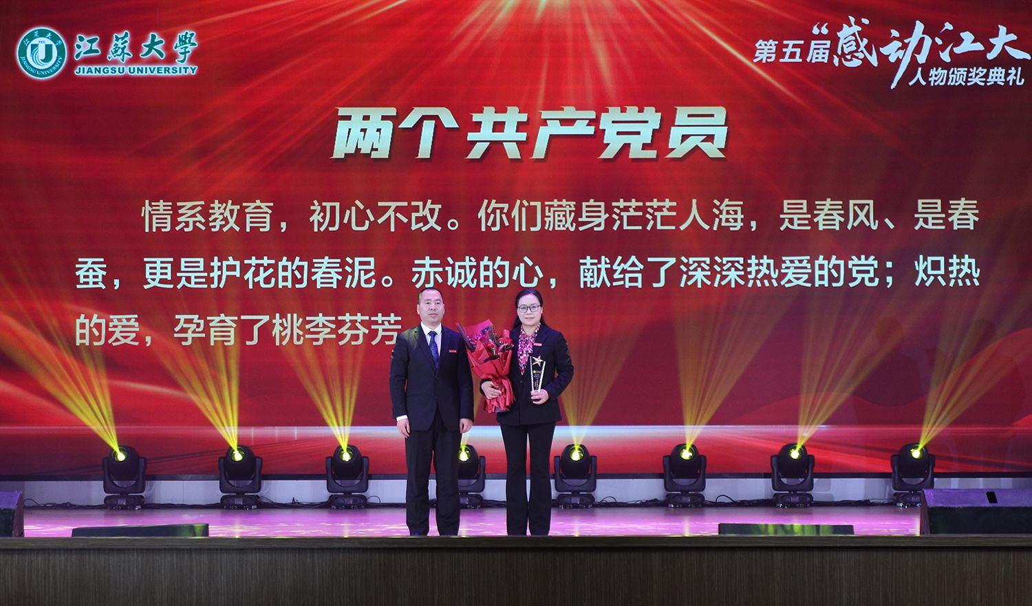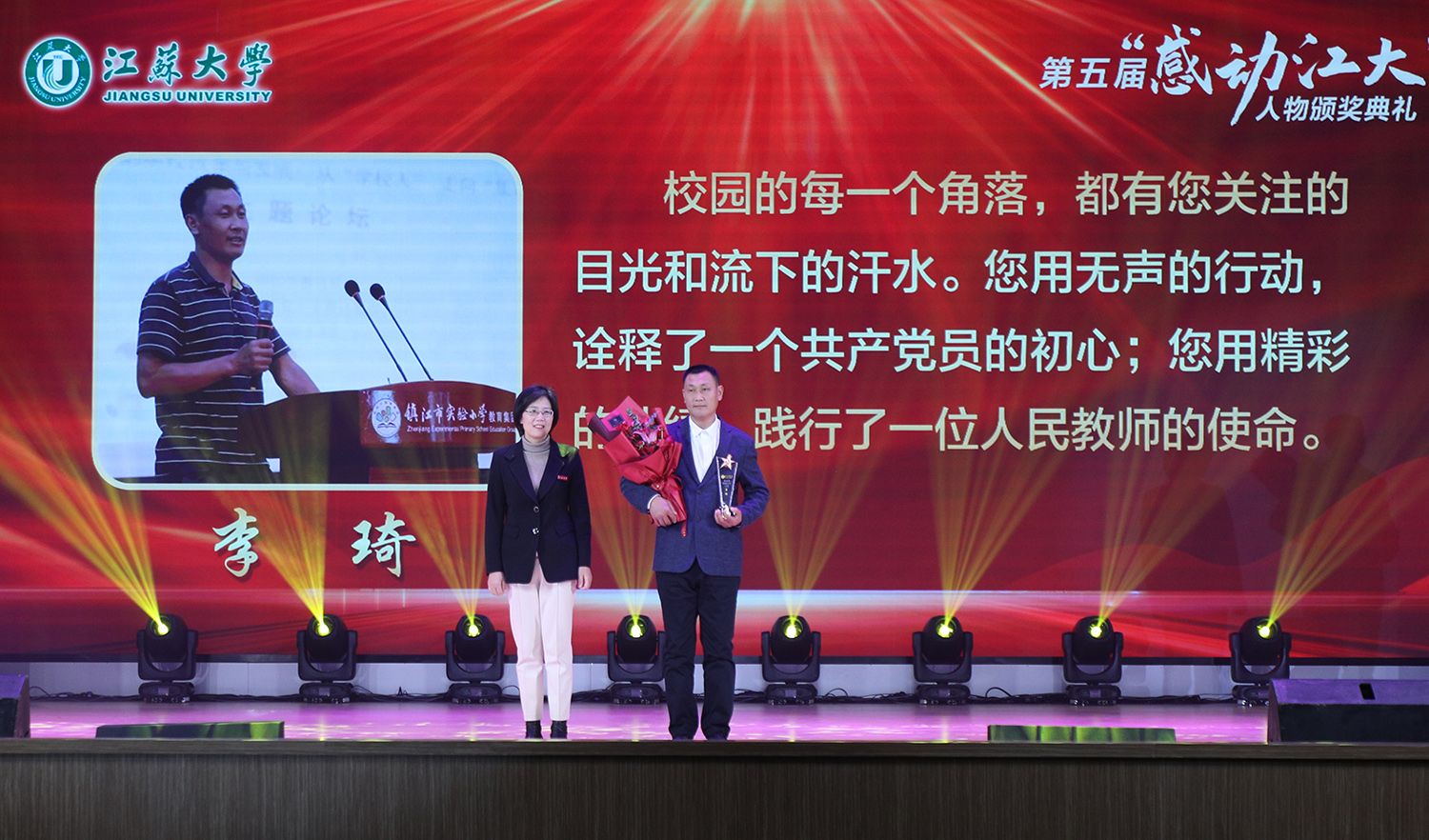 典礼上,持续深耕关心下一代园地,年至耄耋依然初心不改的退休教师金树德;在教育教学改革殿堂孜孜以求、不断创新的电路课程教学团队;热爱科学研究,在嗜盐古菌领域取得卓越成就的食生学院教师崔恒林;出生教育世家,专注教学艺术的管理学院冯缨老师;医者仁心,哪里需要就在哪里的附属医院医生张炜;以校园田径场为家,把普通学生培养成田径冠军的体育部教师景忠伟;精益求精,致力于工匠精神培养的机械工程学院教师黄娟;义务带教,以“老黄牛”和“拓荒牛”的精神投身教育事业的附属学校教师李琦;以伙伴之力舞青春之曲,以鸿鹄之志做奋斗之士的伯藜学社学子;连续11年捐资助学,总金额达55万元却始终不为人知的“两个共产党员”,10个平凡感人的故事,10段不同的经历,伴随着组委会浓缩凝练的致敬词,传递着向善向上向真向美的正能量。