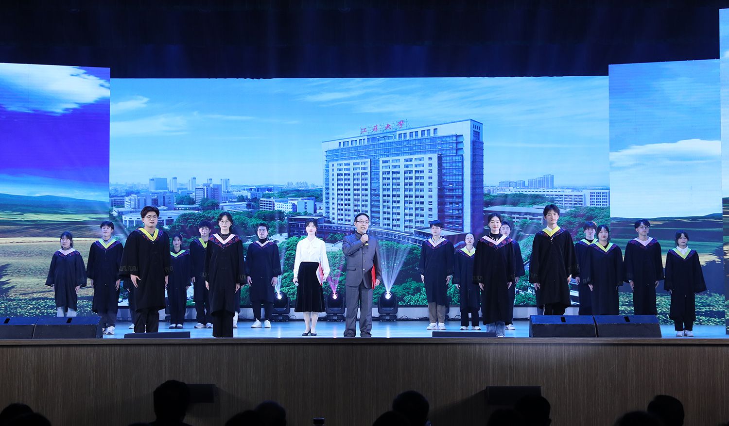典礼上,主持人对10位“感动人物”进行了现场采访,他们质朴真诚的回答引发了现场观众发自肺腑的热烈掌声。活动现场还穿插了精彩的节目表演。人工智能与智能制造学院带来的机器狗表演展示了蓬勃向上的科技力量,开场舞蹈《绽放》将全场激情点燃,师生歌曲联唱传递温暖和希望,诗朗诵《九月问答》字字句句饱含深情,歌伴舞《领航》澎湃激昂、振奋人心。