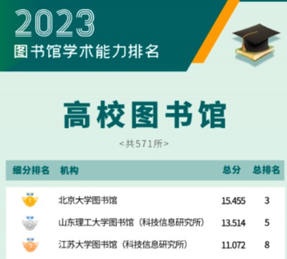 6月19日,图书馆学术评价课题组联合新文科专委会正式发布“2023图书馆学术能力排名”。本次共统计图书情报类机构782所,上榜机构为234所(前30%),九体育线上平台(集团)官方网站图书馆表现优异,位列高校系统第三名。