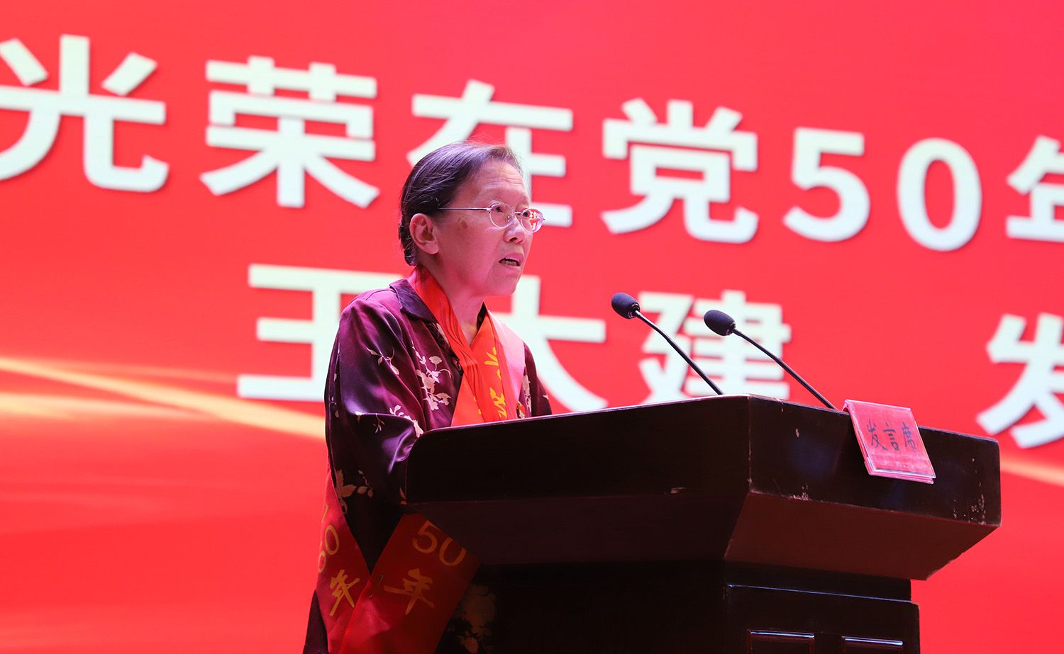 “光荣在党50年”党员代表,我校原医学技术学院调研员王大建同志发言,并带领新党员代表面向党旗宣誓、全体党员代表重温入党誓词。