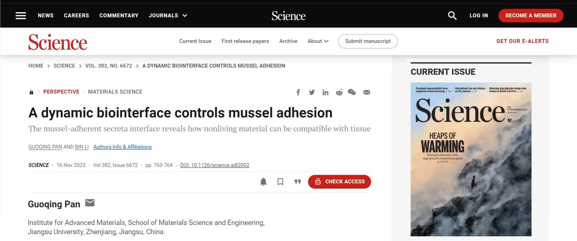 11月17日,国际著名学术期刊Science发表了我校材料科学与工程学院潘国庆教授、苏州大学李斌教授应邀合作撰写的题为A dynamic biointerface controls mussel adhesion(Doi: 10.1126/science.adl2002) 的前瞻性文章。九体育线上平台(集团)官方网站材料科学与工程学院、新材料研究院为该论文的第一单位,潘国庆为论文的第一作者及通讯作者。