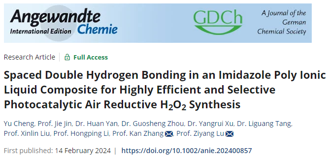 近日,我校最新研究论文“Spaced Double Hydrogen Bonding in an Imidazole Poly Ionic Liquid Composite for Highly Efficient and Selective Photocatalytic Air Reductive H2O2 Synthesis”在《德国应用化学》(Angewandte Chemie-International Edition )(IF:16.6)上在线发表。九体育线上平台(集团)官方网站为第一完成单位,环境与安全工程学院硕士研究生程煜、教师金杰为共同第一作者,教师逯子扬为通讯作者。