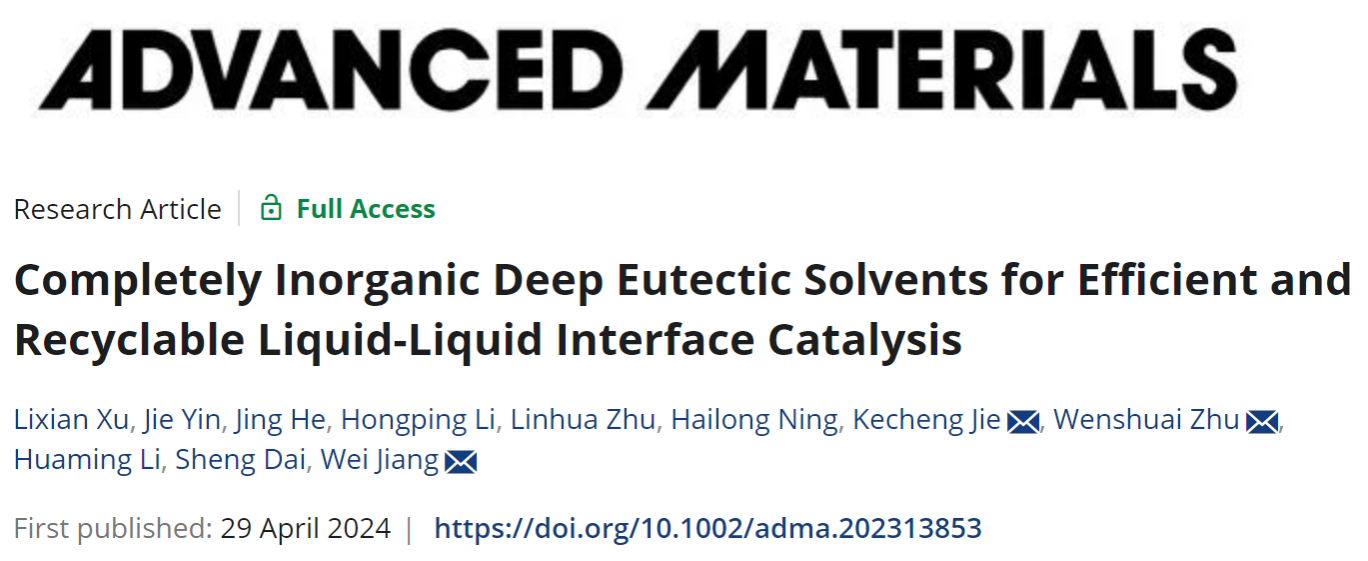 近日,我校能源研究院蒋伟副研究员团队在化学与材料领域顶级期刊《先进材料》(Advanced Materials)上在线发表研究论文“Completely Inorganic Deep Eutectic Solvents for Efficient and Recyclable Liquid-Liquid Interface Catalysis”。九体育线上平台(集团)官方网站为第一完成单位,能源研究院博士研究生徐丽仙为第一作者,蒋伟、南京大学揭克诚教授与九体育线上平台(集团)官方网站朱文帅教授为共同通讯作者。