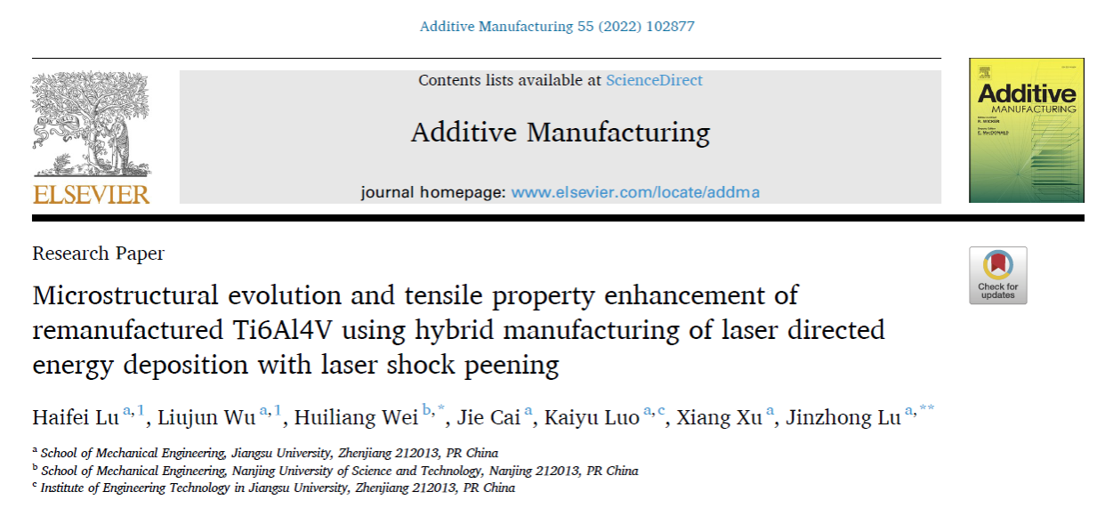 近日,经初评推荐、资格审查、专业评审、综合评审等程序,机械工程学院鲁金忠教授团队发表在《Additive Manufacturing》上的SCI高被引论文“Microstructural evolution and tensile property enhancement of remanufactured Ti6Al4V using hybrid manufacturing of laser directed energy deposition with laser shock peening(激光热力交互沉积再制造Ti6Al4V合金微观组织演变和拉伸性能强化)”入选2024年江苏省自然科学百篇优秀学术成果论文推选(九体育线上平台(集团)官方网站唯一入选)。青年教师卢海飞副教授为第一作者,鲁金忠和南京理工大学韦辉亮教授为共同通讯作者。该工作得到国家自然科学基金(51775250)等资助。